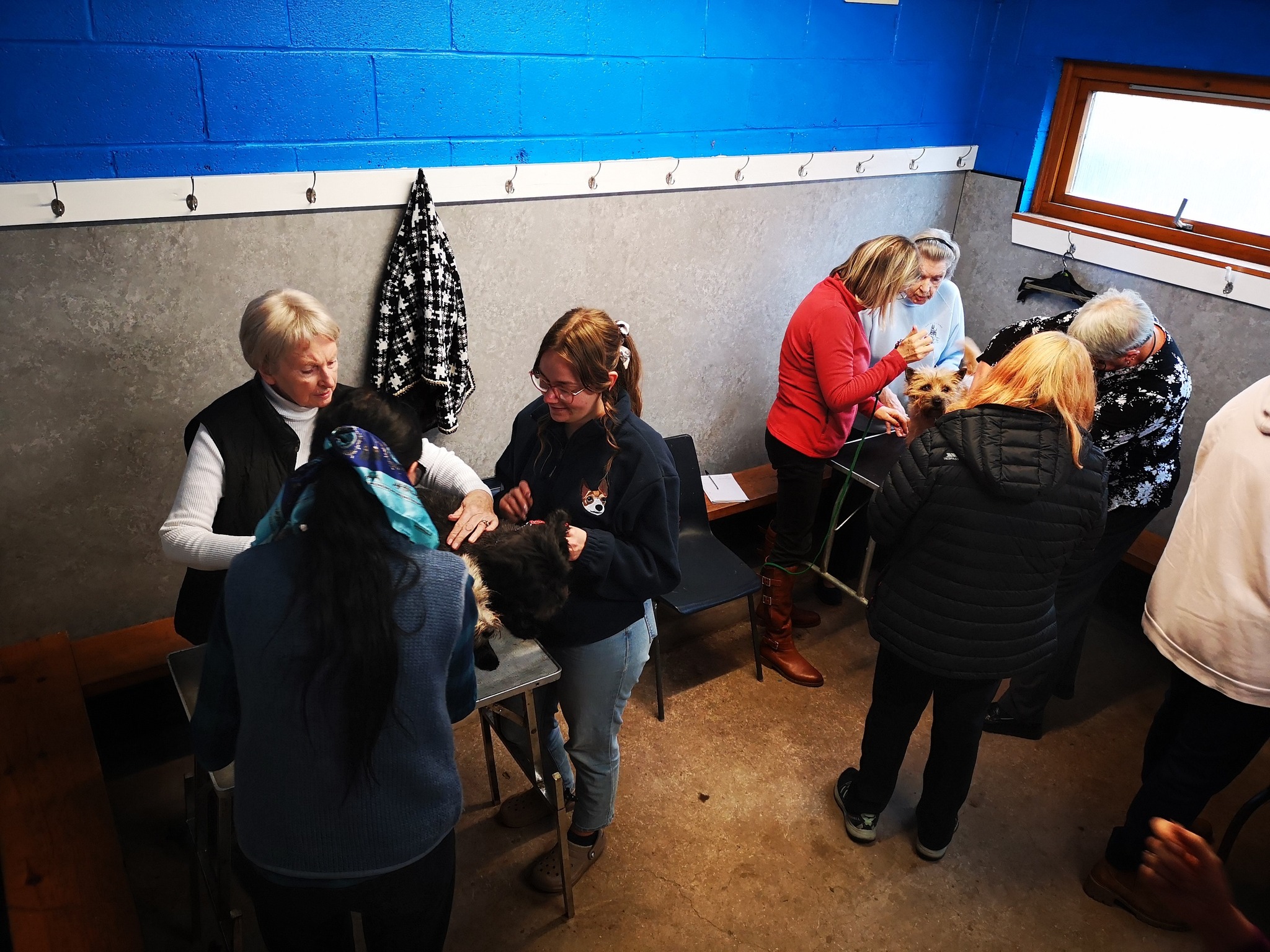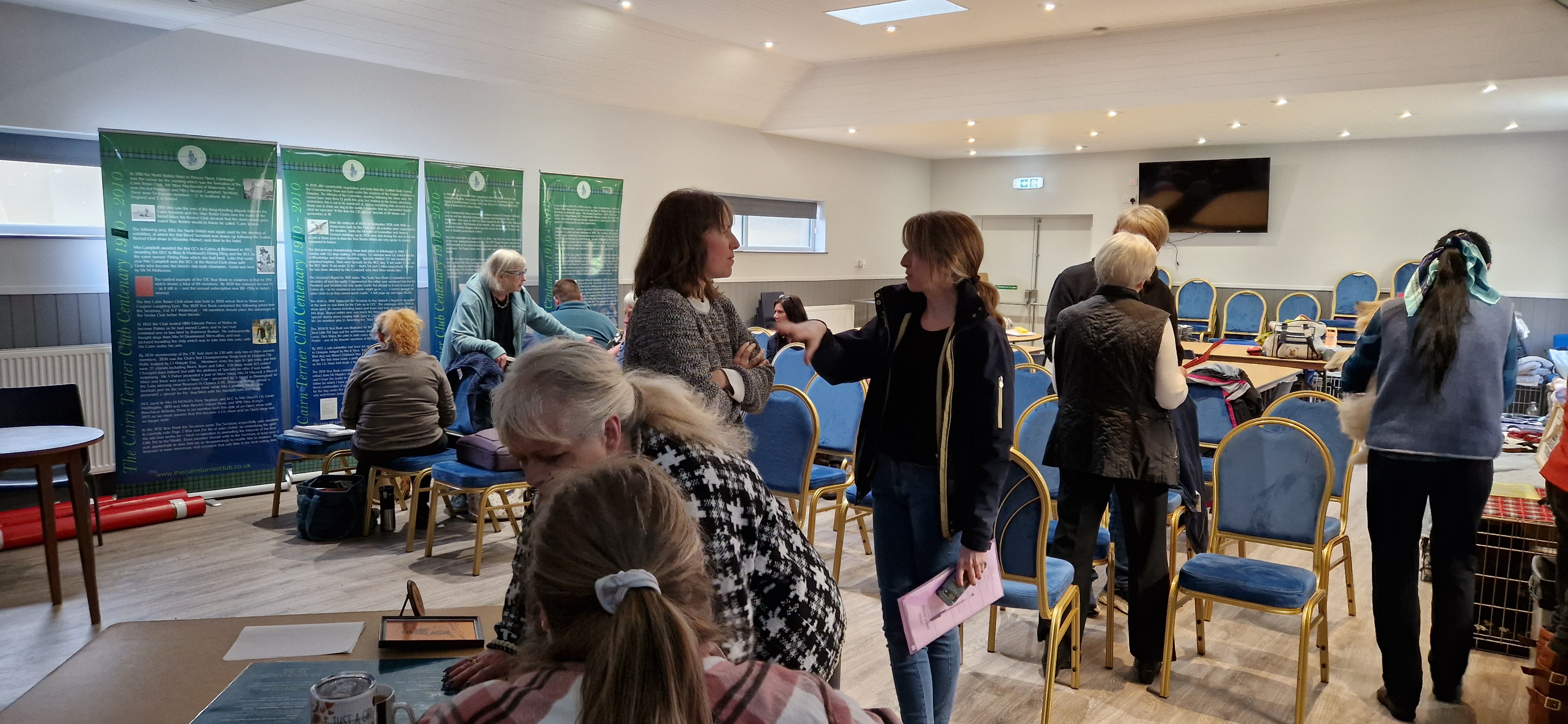 Here it was off to the Rugby Club changing room where a number of Cairns were presented to allow people to get some guided hands on experience of the dogs. Many thanks to those who led this (Sally Latto, Sybil Berrecloth, and Pamela Gardner (Aberforth)).